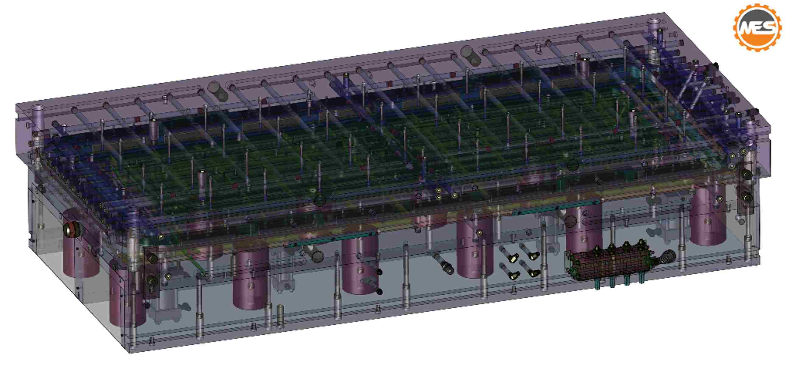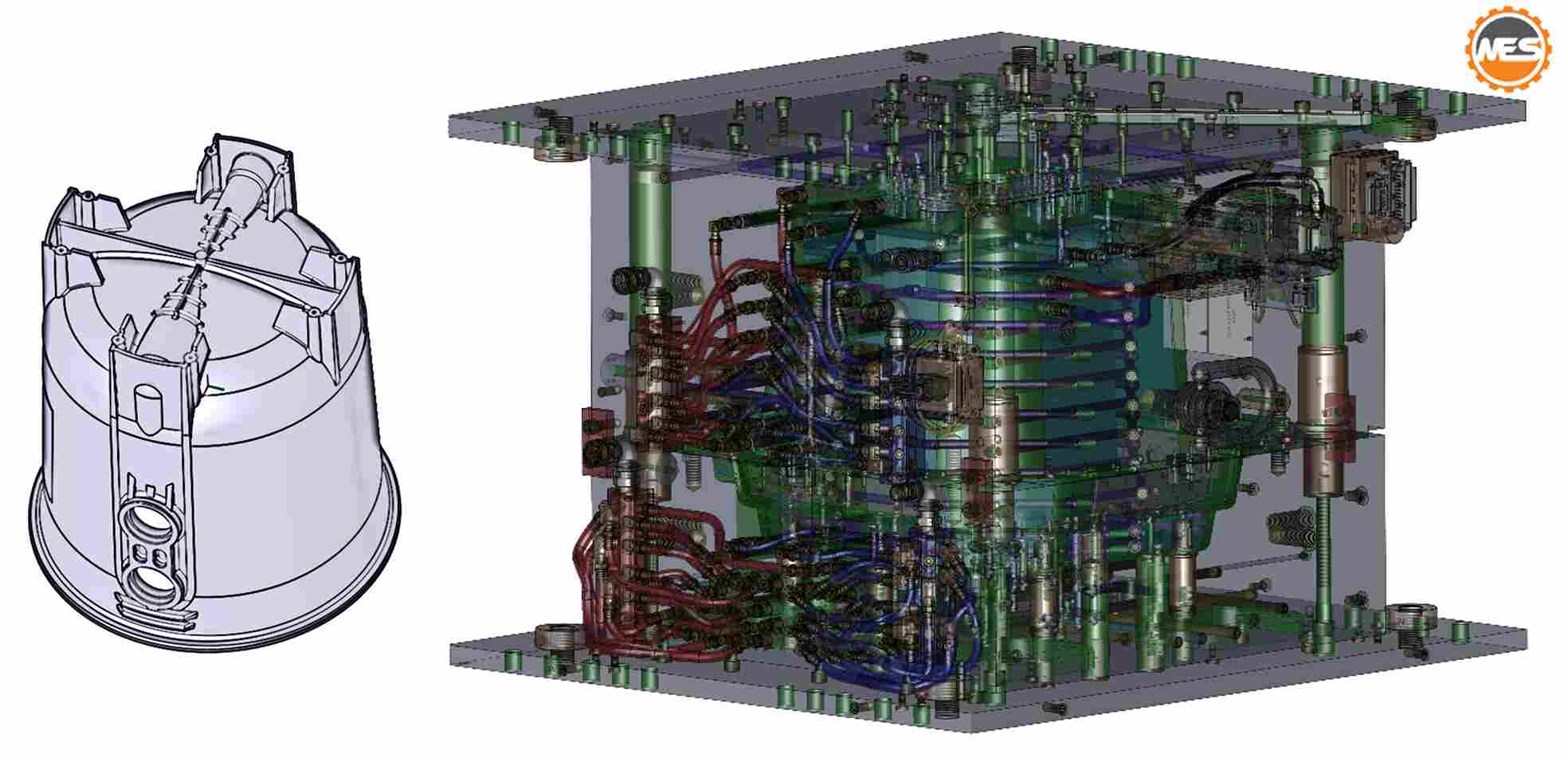 Reverse Injection Tool, Hydraulic Floating Core assembly with an ejection system, Large sliders, Bar Lifters, Two Drop Hot Runner System, Hydraulic Ejection. Mold weight 70000 lbs.